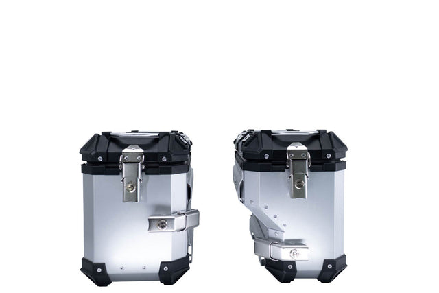 Pair of side cases aluminum made with contoured right side, silver color with specific pannier holder