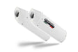 The BMW K1600GT GPR Albus Evo4 Dual Slip On exhaust system delivers superior performance and sound. This GPR exhaust features white glossy oval silencers with matching endcaps. The Albus series includes aluminum construction with CNC-machined Avional caps and ceramic treatment. The dual slip-on system connects seamlessly with specific link pipes and brackets for straightforward installation. The exhaust produces enhanced power output while maintaining EPA compliance. GPR crafts this system in Italy with premium materials and expert TIG welding.